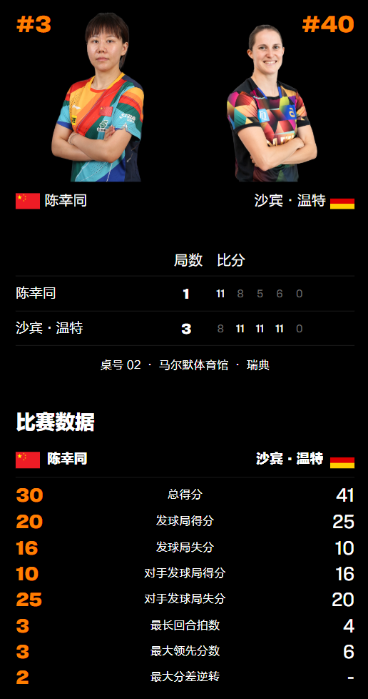 北京时间8月22日凌晨,乒乓球WTT欧洲大满贯瑞典站结束最后一场女单1/8决赛,不久前才夺得WTT横滨冠军赛女单冠军的国乒主力陈幸同苦战4局被淘汰,1-3不敌德国怪胶手温特。